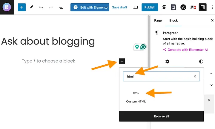 After that, click on the plus icon and type “HTML” in the search box. Then click on the “Custom HTML” block that appears below.