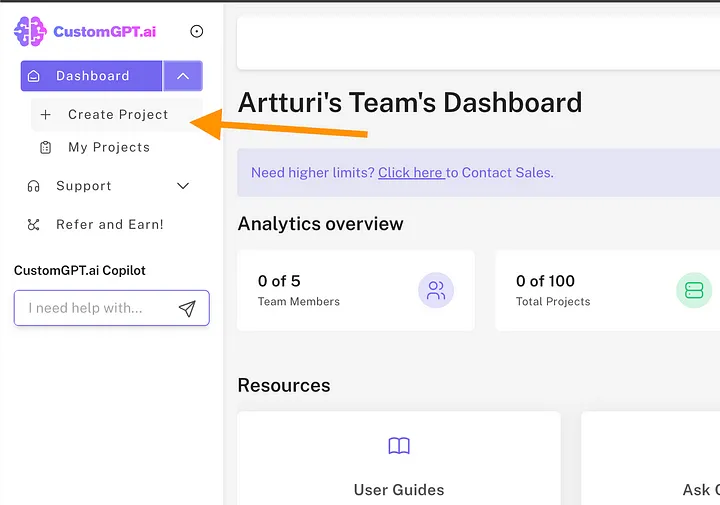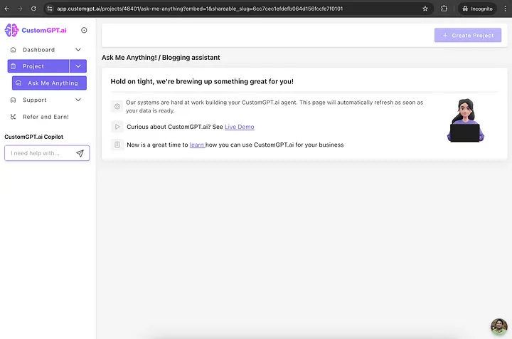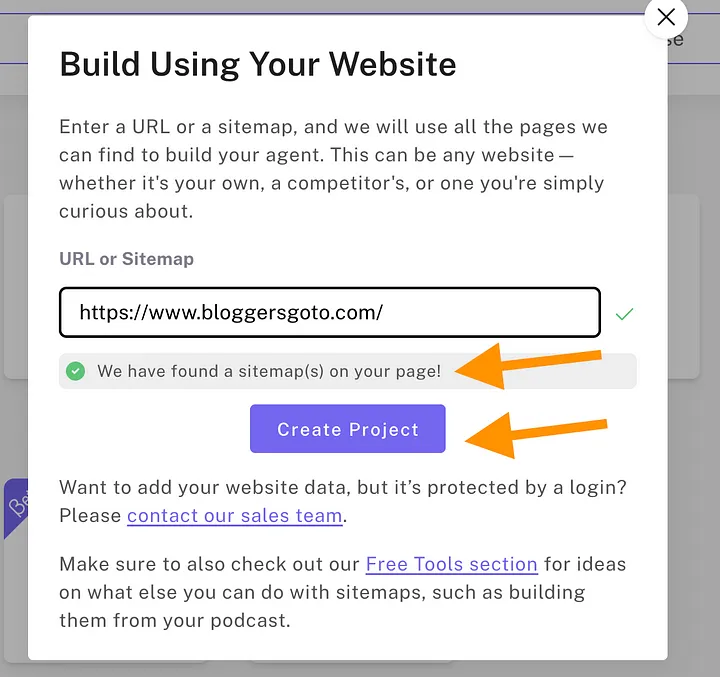 Once the search completes and your sitemap is found, click on Create Project. Now the initial version of your chatbot is ready! Then it’s time to customize it to match your brand and needs.