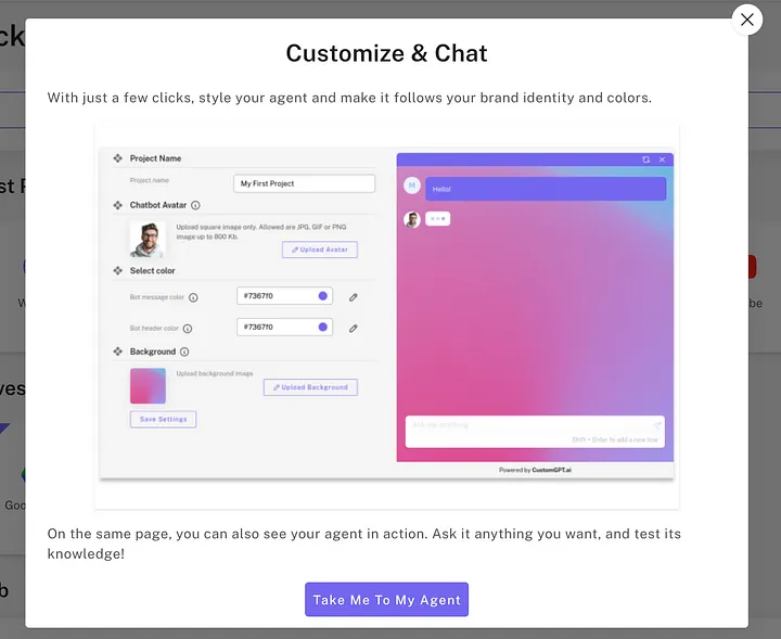 Next, click on Take Me To My Agent to start customizing your AI.