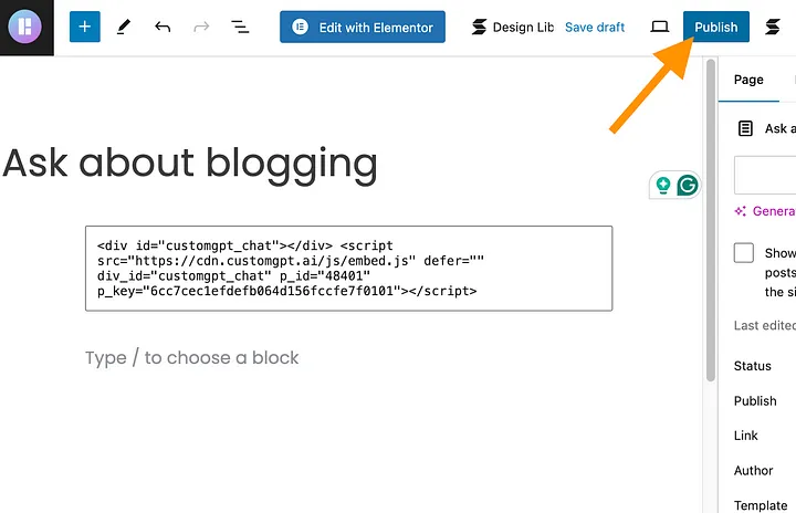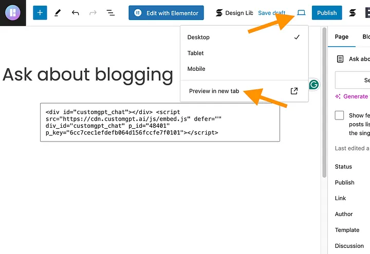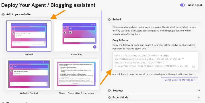 Go back to your CustomGPT agent deployment view and choose “Embed” as the chatbot style. Then copy the code on the right to your clipboard.