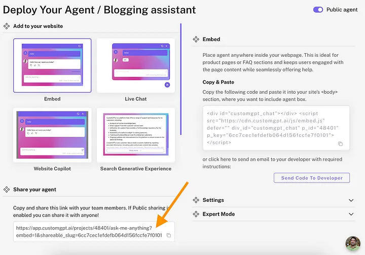 Remember that you can also share a CustomGPT bot directly via a link that you get in the Agent’s dashboard: