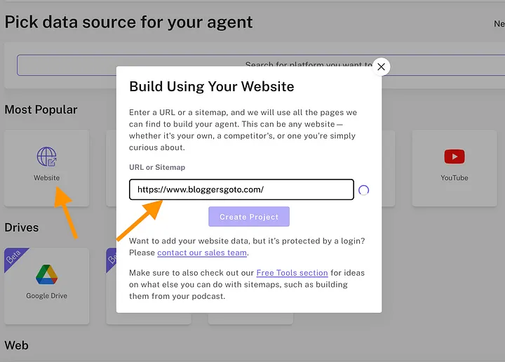 You can pick your data source to be your website, text files, documents, Zapier, WordPress site, YouTube channels, and more.
