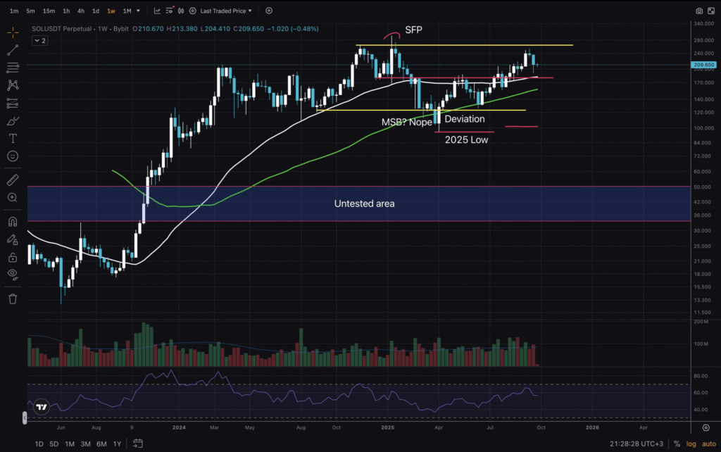 Starting today’s analysis with the 1W chart, we can see an untested area between $35-50 on SOL. But price has spent almost 2 full years in the upper range, and it seems unlikely that it will retrace so far down.